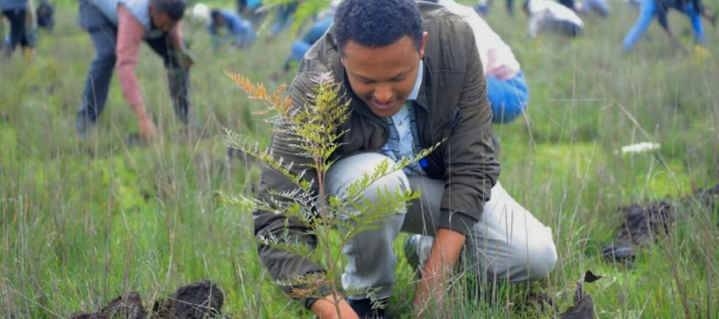 A participant plants local green plants in a park as part of Ethiopia’s Green Legacy Initiative, which aims to plant 7.5 billion trees by the end of the year, at Jifara Ber site, Addis Ababa, Ethiopia, in July 2025. (AP Photo/Amanuel Birhane)